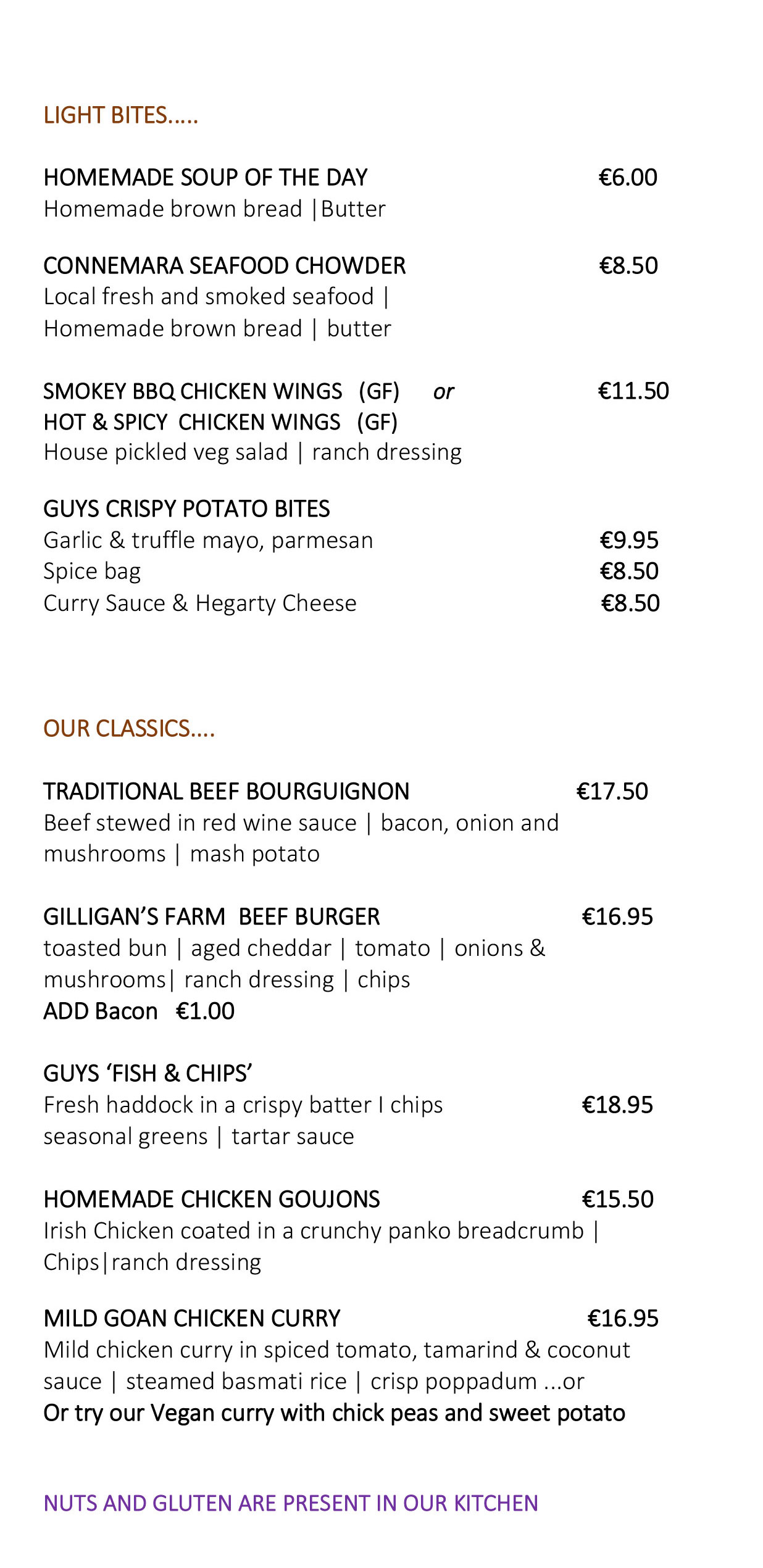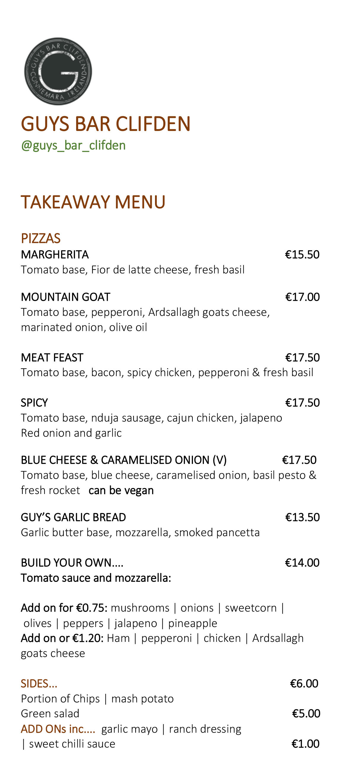 To order food and drinks for takeaway please call ahead on 095 21130 or call in to Guys.